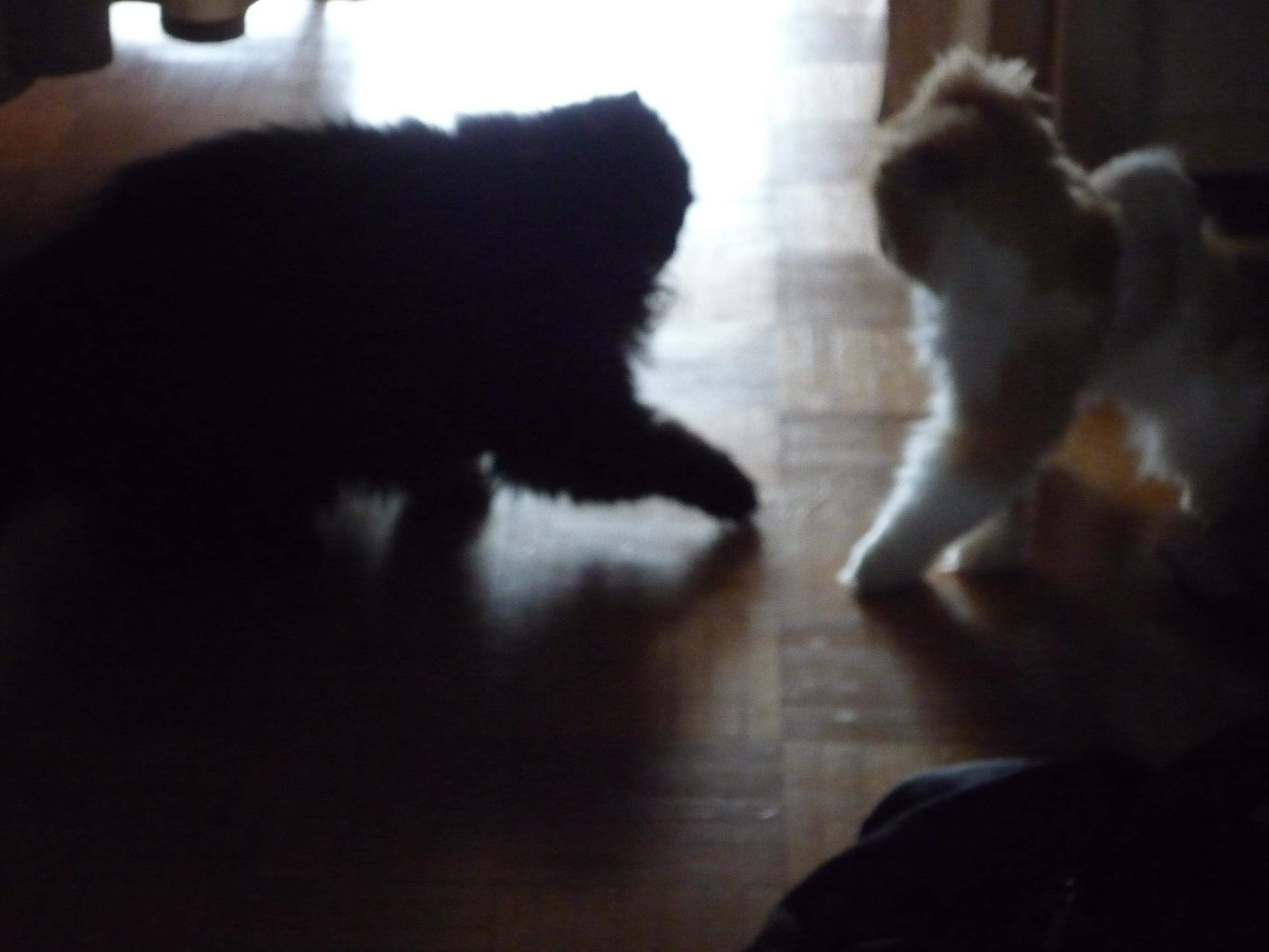 Meine Hoffnung war ja von Anfang an, dass die beiden - angeblich gleichaltrigen Kater von ähnlichem Temperament (Rubys Beschreibung auf der Tierheim-Homepage war schlichtweg falsch) - sich miteinander beschäftigen und gemeinsam spielen.