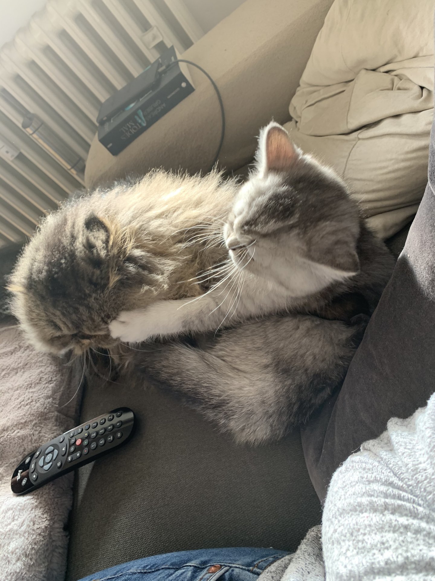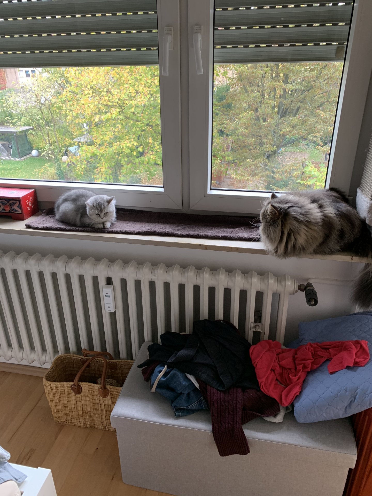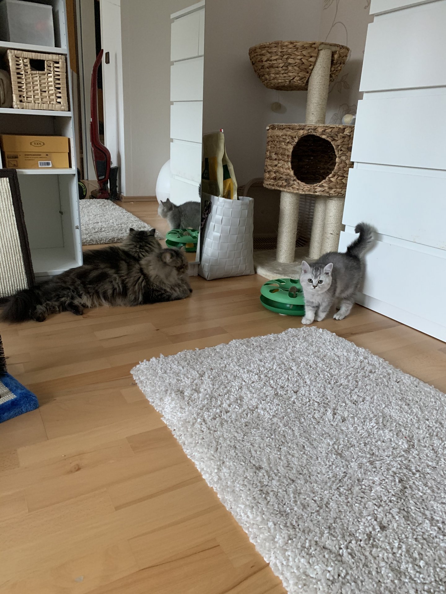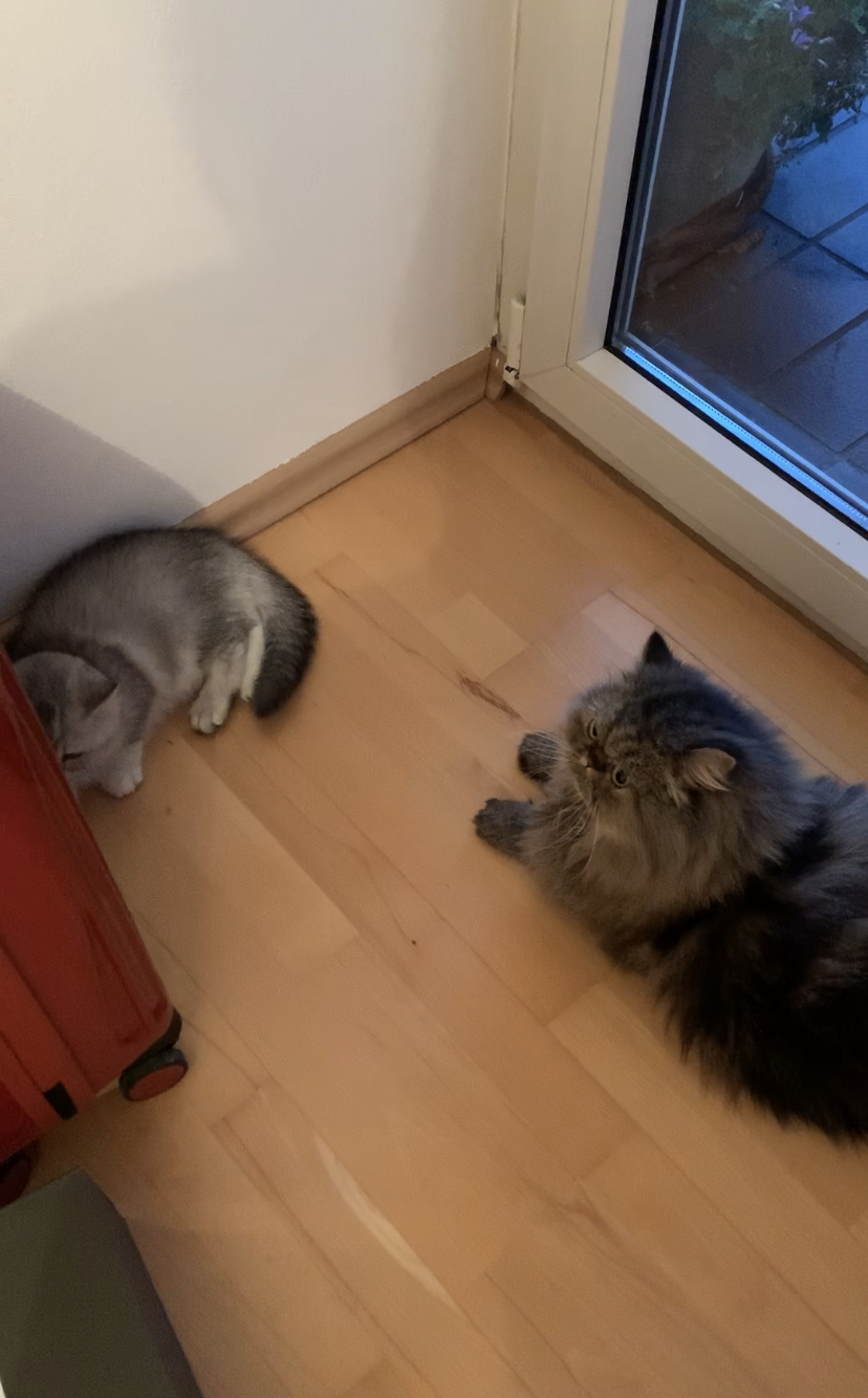 Die beiden schlafen in den gleichen Räumen wenn wir da sind und beide fressen gut und gehen aufs Katzenklo.
