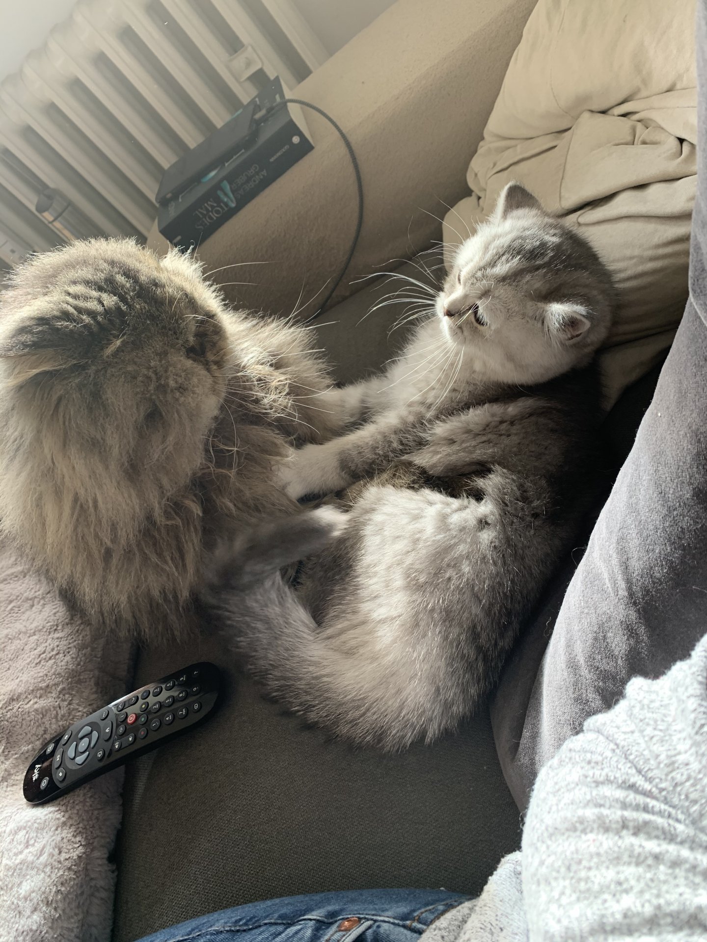 Sie beschnuppern sich, er schleckt sie auch mal ab, sie drückt ihren Kopf an seinen aber das sind nur kurze Momente und ansonsten jackt der Große gerne die Kleine durch die Wohnung und bedrängt sie. Sie faucht ihn an und knurrt, er steht dann kurz über ihr, der Schwanz geht wild hin und her, Ohren auf Halbmast, miaut sie an und im nächsten Moment schmeißt er sich auf den Rücken und zeigt ihr den Bauch. Ist das Spiel oder bitterer Ernst?